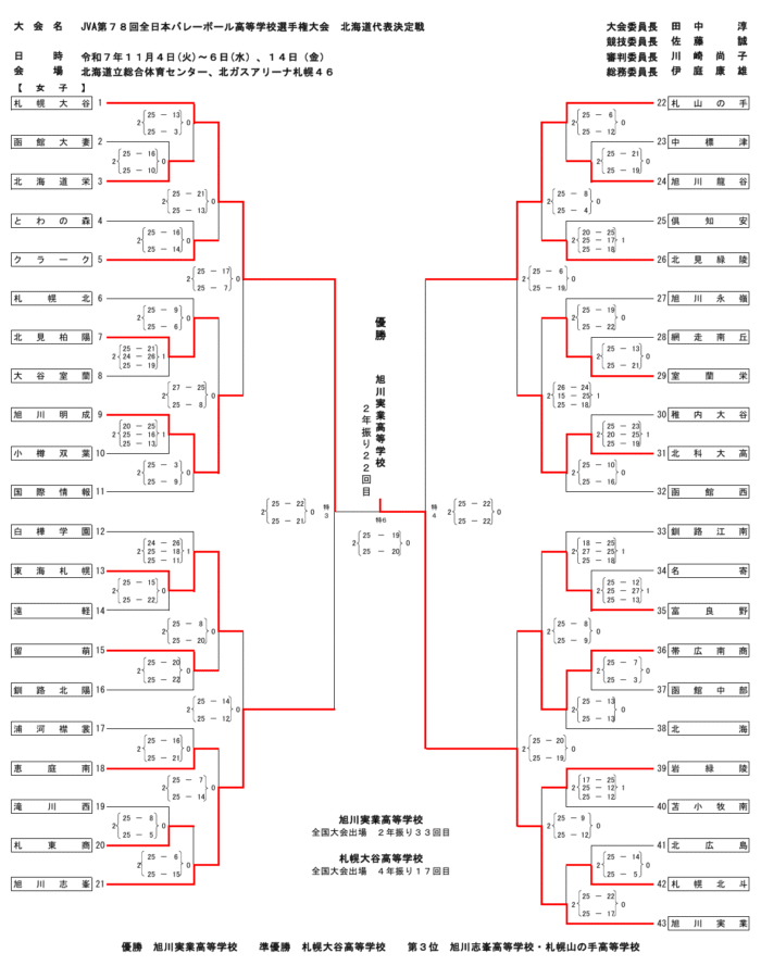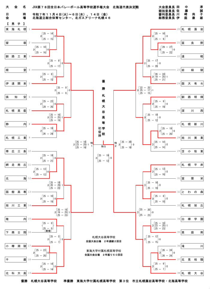 2025年度 JVA 第78回全日本バレーボール高等学校選手権大会 北海道代表決定戦 競技:2025年11月4日(火)~6日(木)、14日(金) 場所:北海道立総合体育センター、北ガスアリーナ札幌46 1日目 2日目男子 2日目女子 3日目男子 3日目女子 最終日